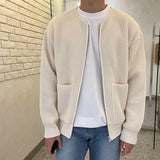This men’s minimalist zip-up cardigan features a round neckline, ribbed texture, and front patch pockets for a sleek and understated fit. Perfect for casual layering, it pairs easily with jeans and tees for effortless everyday styling. A staple piece for simple, street-ready outfits.