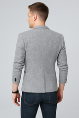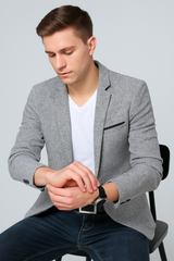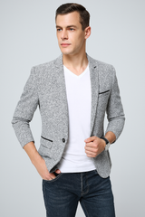 The light gray men’s blazer is the perfect piece for those seeking effortless elegance in their daily style. With a modern texture and impeccable finish, it adds an urban and contemporary touch to any look. The slim fit cut enhances the silhouette, while the black pocket details provide contrast and personality. Perfect to pair with basic T-shirts and jeans, it’s a versatile choice for sophisticated casual outfits.