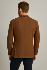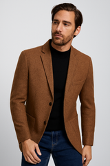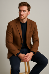 The men’s brown textured wool blazer is an essential piece for those who value timeless elegance and understated sophistication. With a slim cut and refined finish, this blazer delivers a polished look for formal, professional, or social occasions. Its versatile earthy tone pairs perfectly with darker pieces, such as black shirts or navy sweaters, creating an elegant and modern contrast.