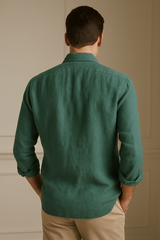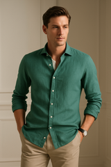 The men’s emerald green linen shirt is the perfect combination of sophistication and comfort. With a timeless design, it features a lightweight and breathable structure, ideal for warmer days or for creating elegant yet relaxed looks.